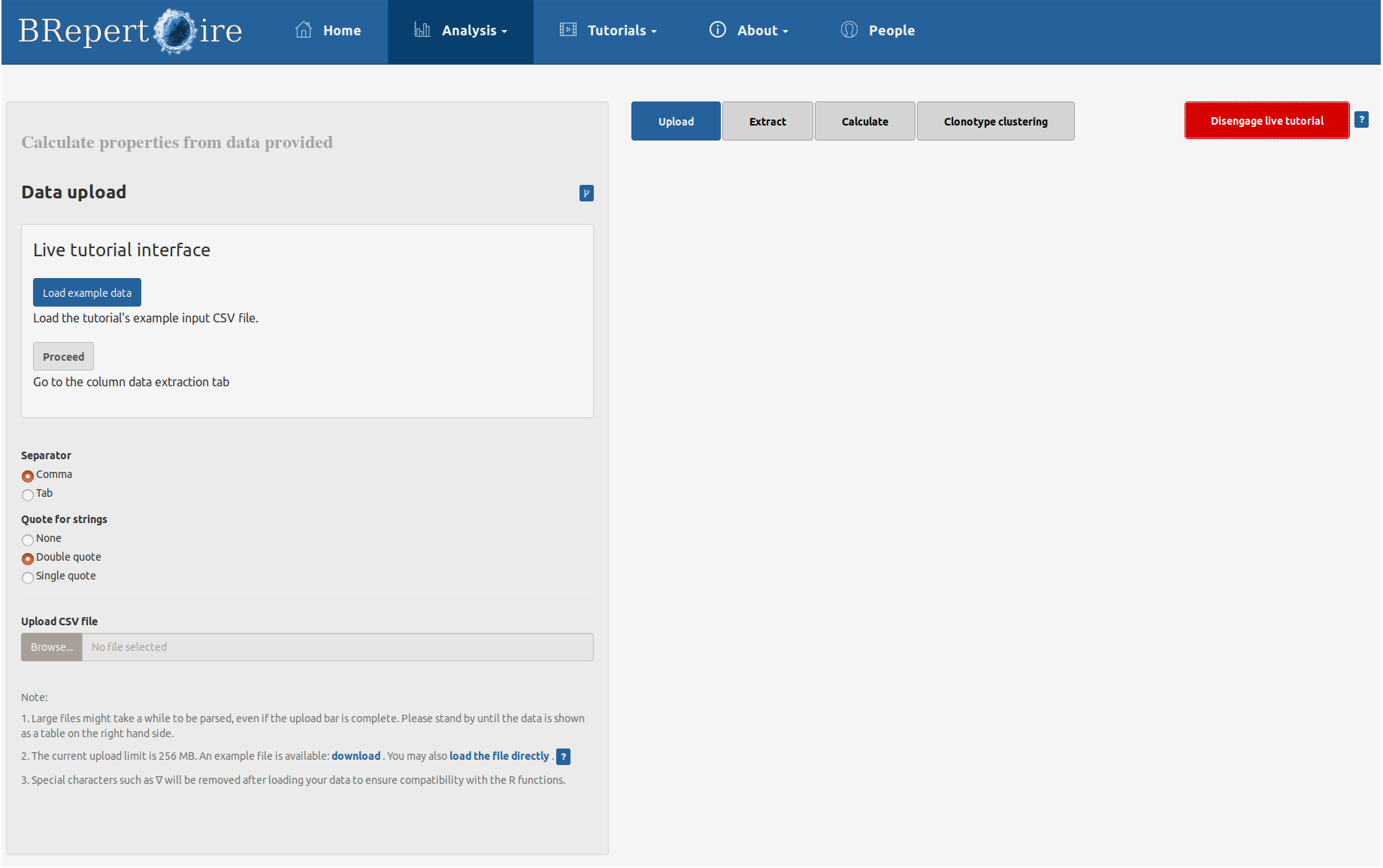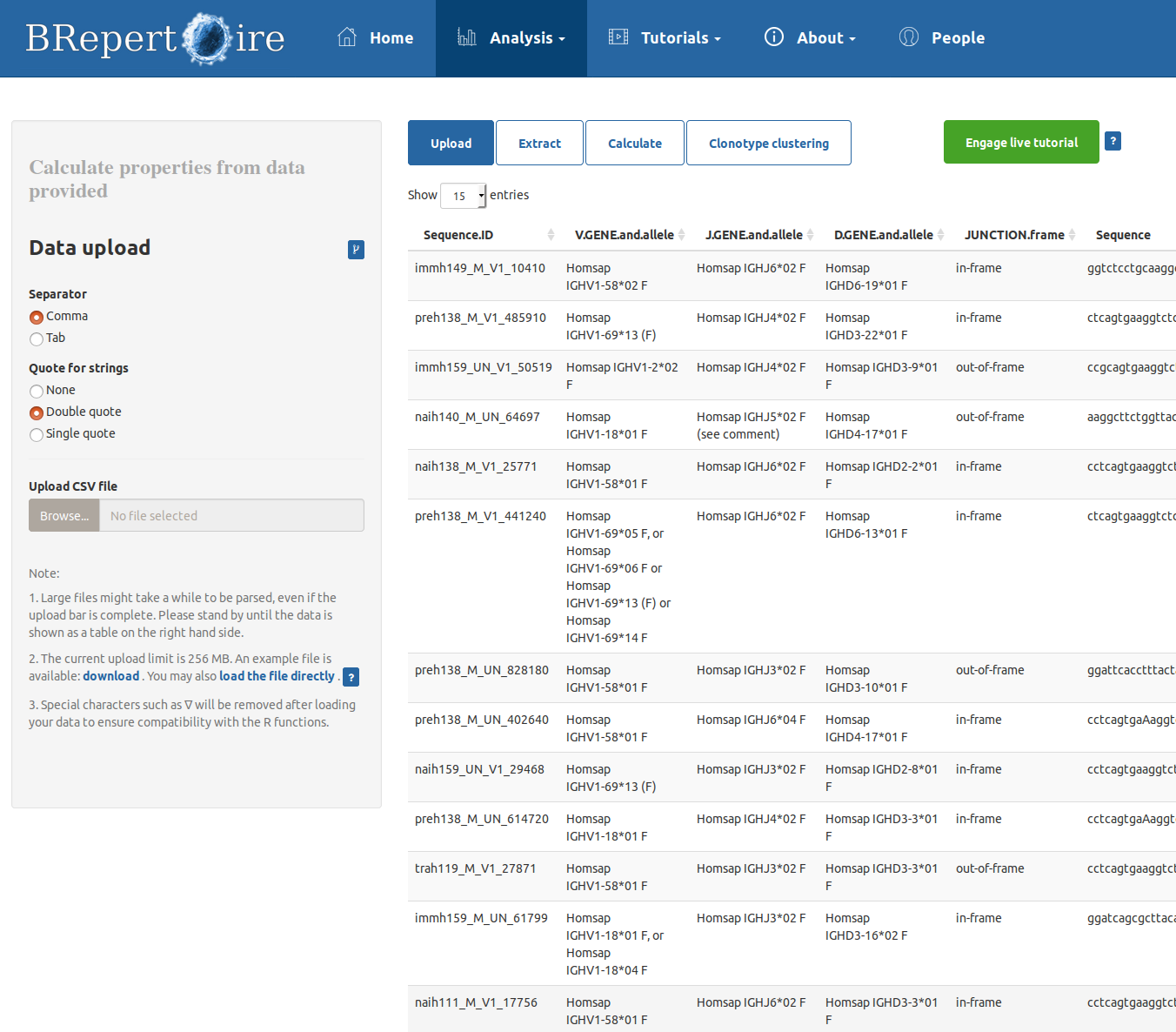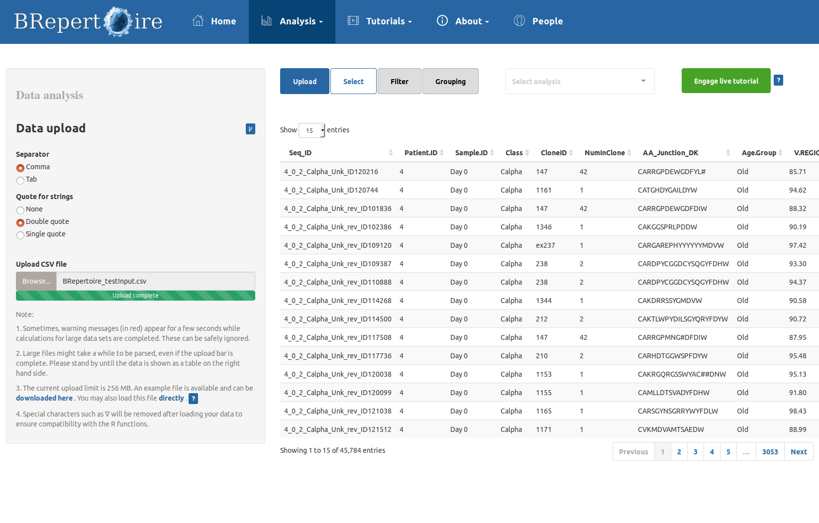 Welcome to the tutorial for the data analysis branch of BRepertoire. As usual, the interface to set the options is on the left-hand side and the results are displayed on the right next to it. In this first step, you need to provide the data to be analysed by uploading a CSV file from your local machine. This file can either be generated by exporting your data from various programs such as Microsoft Excel or Libre Office Calc, programming languages such as R or by using the "Manage IMGT/V-Quest output" function on this server. Most often, the entries in these text files are separated by commas and strings are enclosed by double quotes, but you can set this according to your file if necessary. By clicking on "Browse", you will be able to select the file of choice from your hard drive. Note, that currently the upload size limit is 256 MB, to enable fast server response times. You can find this and other hints in the notes on the respective sites. Also, by moving the mouse cursor over the blue question marks, help texts pop up to provide further explanations. For the sake of this tutorial, we will use an example file that has been prepared using the "Management IMGT/V-Quest" and "Calculation" branches of BRepertoire. You can download it by clicking "here", as stated by the respective help text, or load it directly to the server. We will do the latter now, but feel free to have a look at the file to get an idea of the format. Note, that whenever you perform an action that might take a while, a progress bar pops up that informs you of the current status and steps performed. Please wait before further input while these actions are executed to avoid "jumps". After loading and parsing the data, which includes the removal of special characters from labels to ensure proper data handling afterwards, the data is shown as a table on the right-hand side. The data can be sorted by the column values for visual inspection and the bottom of the table offers a navigation interface. This will have no effect on the subsequent analysis, although it is usually a good idea to make sure that the columns look as you would expect them to. At the bottom, you see how many rows your dataset contains. The names of the columns are not pre-defined as long as they are unique, which is in contrast to the fixed column names used by IMGT/V-Quest. Note, that the button "Select" has now been enabled and so when you are satisfied with the upload, please proceed to this step.
