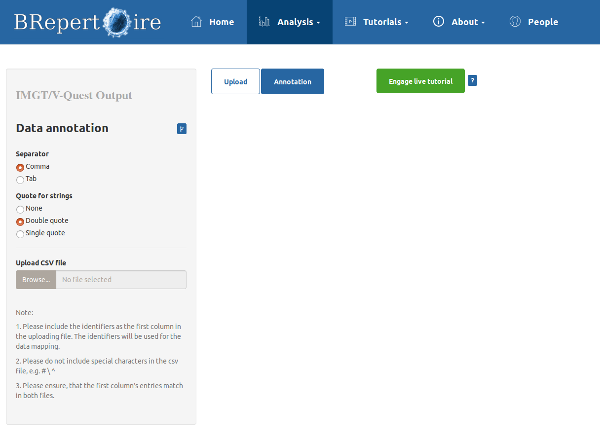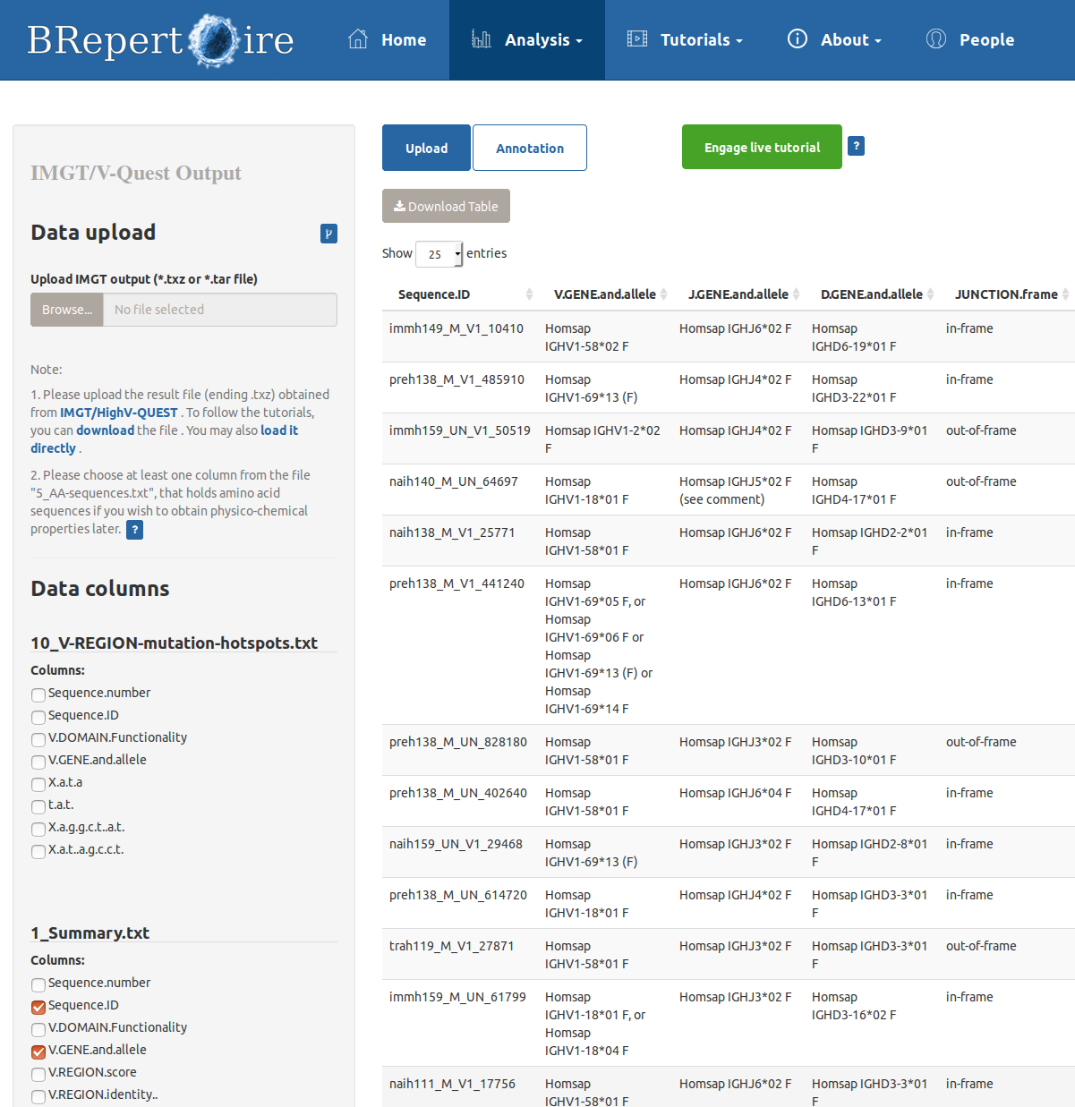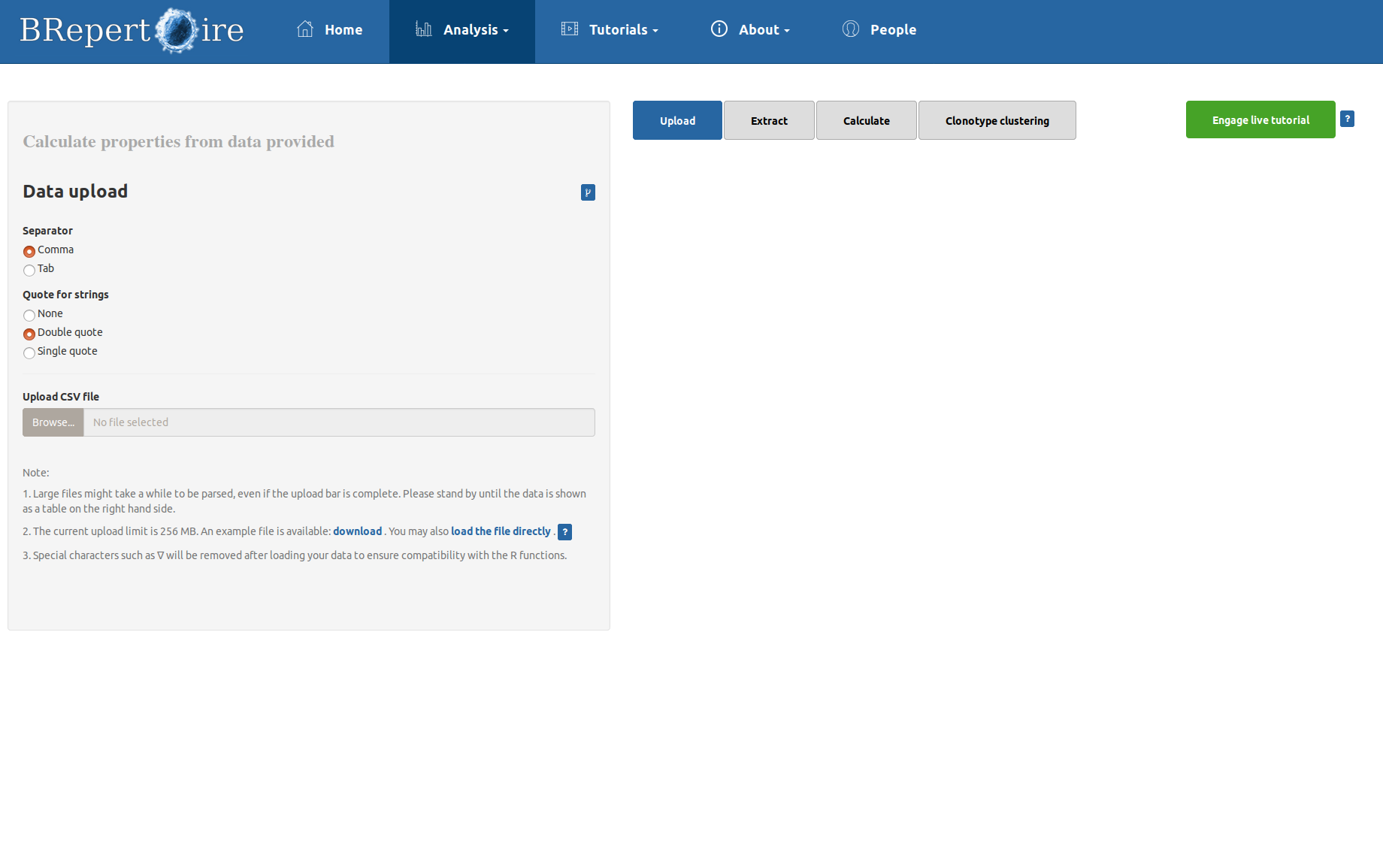 Welcome to the tutorial for the data analysis branch of BRepertoire. As usual, the interface to set the options is on the left-hand side and the results are displayed on the right next to it. In this first step, you need to provide the data to be analysed by uploading a CSV file from your local machine. This file can either be generated by exporting your data from various programs such as Microsoft Excel or Libre Office Calc, programming languages such as R or by using the "Manage IMGT/V-Quest output" function on this server. Most often, the entries in these text files are separated by commas and strings are enclosed by double quotes, but you can set this according to your file if necessary. By clicking on "Browse", you will be able to select the file of choice from your hard drive. Note, that currently the upload size limit is 256 MB, to enable fast server response times. You can find this and other hints in the notes on the respective sites. Also, by moving the mouse cursor over the blue question marks, help texts pop up to provide further explanations. For the sake of this tutorial, we will use an example file that has been prepared using the "Management IMGT/V-Quest" and "Calculation" branches of BRepertoire. You can download it by clicking "here", as stated by the respective help text, or load it directly to the server. We will do the latter now, but feel free to have a look at the file to get an idea of the format. Note, that whenever you perform an action that might take a while, a progress bar pops up that informs you of the current status and steps performed. Please wait before further input while these actions are executed to avoid "jumps". After loading and parsing the data, which includes the removal of special characters from labels to ensure proper data handling afterwards, the data is shown as a table on the right-hand side. The data can be sorted by the column values for visual inspection and the bottom of the table offers a navigation interface. This will have no effect on the subsequent analysis, although it is usually a good idea to make sure that the columns look as you would expect them to. At the bottom, you see how many rows your dataset contains. The names of the columns are not pre-defined as long as they are unique, which is in contrast to the fixed column names used by IMGT/V-Quest. Note, that the button "Select" has now been enabled and so when you are satisfied with the upload, please proceed to this step.