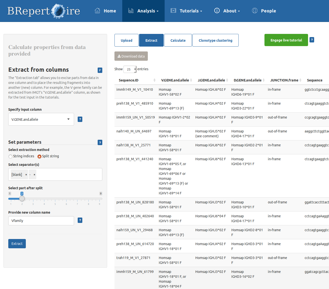 The IMGT/V-Quest server provides you with a lot of useful data and annotation. However, you might want to obtain additional information, which is what the "Calculation" branch implements. On the left-hand side, you can upload your data arranged in a spread-sheet by clicking "Browse". You may have obtained it from the "IMGT/V-Quest" branch of this server or from any other source - as long as you specify the format settings properly (e.g. whether the separator is a comma or tabulators), you should be able to load any well-defined spread sheet. For this tutorial, you should now load the example input we have prepared for you. You can either download it first and do the upload manually afterwards or load it directly by clicking on the respective link. For most tasks, you will see a progress bar which monitors the current status of the calculation. On the right hand-side, you see the contents of the uploaded file. Note, that the (formerly) grey buttons on the top have now been enabled. You may now proceed to the "Extract" tab.