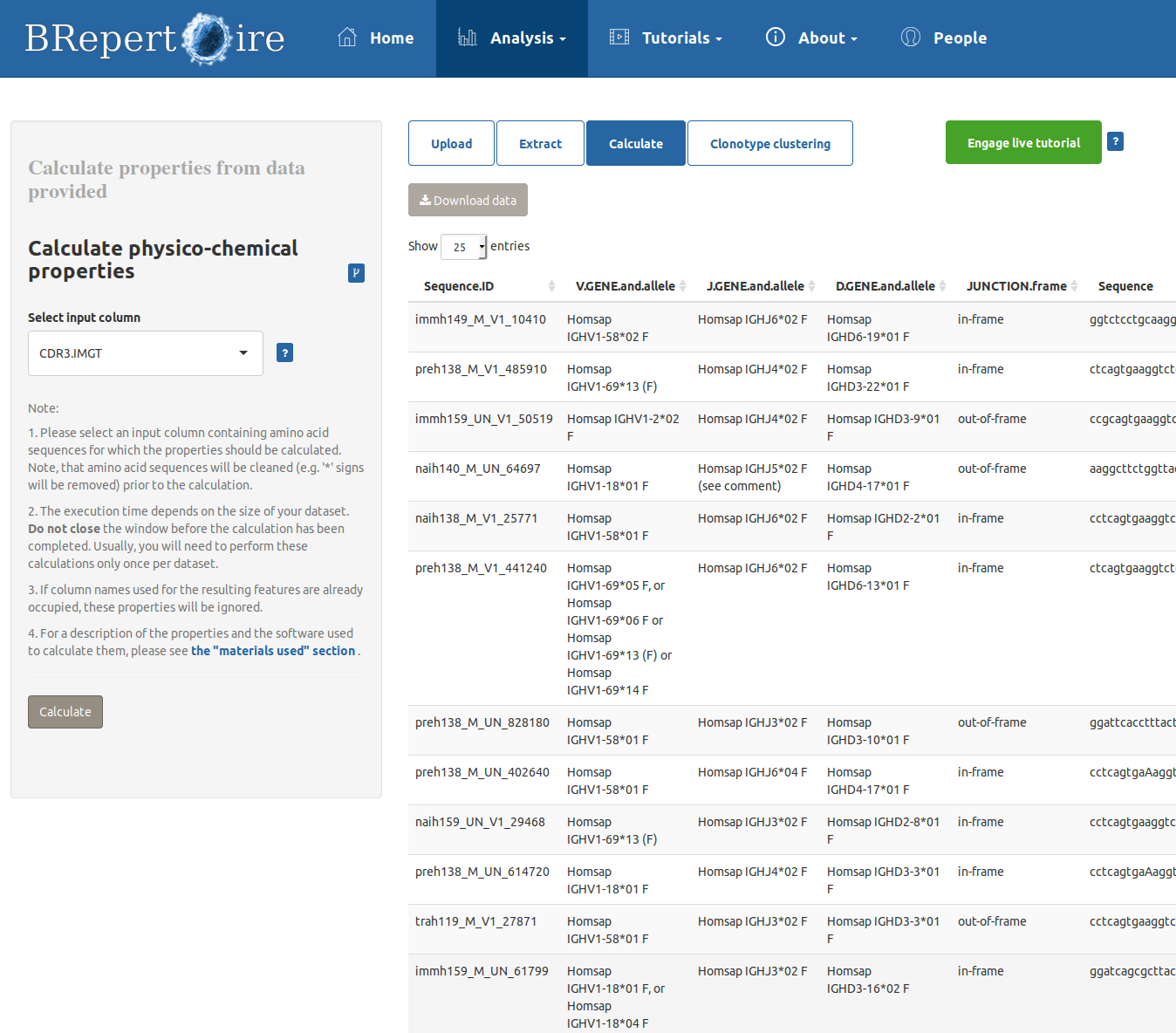 For every framework region or CDR in your dataset, you can calculate features such as hydrophobicity, amino acid length, the fraction of charged, polar, aromatic, etc. amino acids or the Kidera factors to describe your sequences on a more basic, chemical level. These properties will be added as additional columns at the end of the table. For this tutorial and the associated test input, only one column holding amino acid sequences is available, namely "CDR3.IMGT", the CDR3 of the heavy chain. When you click on "Calculate", the processing starts and the status is shown by a progress bar. Depending on the size of your dataset, this might take a while so please hang on and do not close the browser in the meantime. After completion, you can download the table by clicking on "Download data" and use this file as input for the data analysis branch of BRepertoire if you like. You can also import CSV files into programs like Microsoft Excel and LibreOffice Calc.