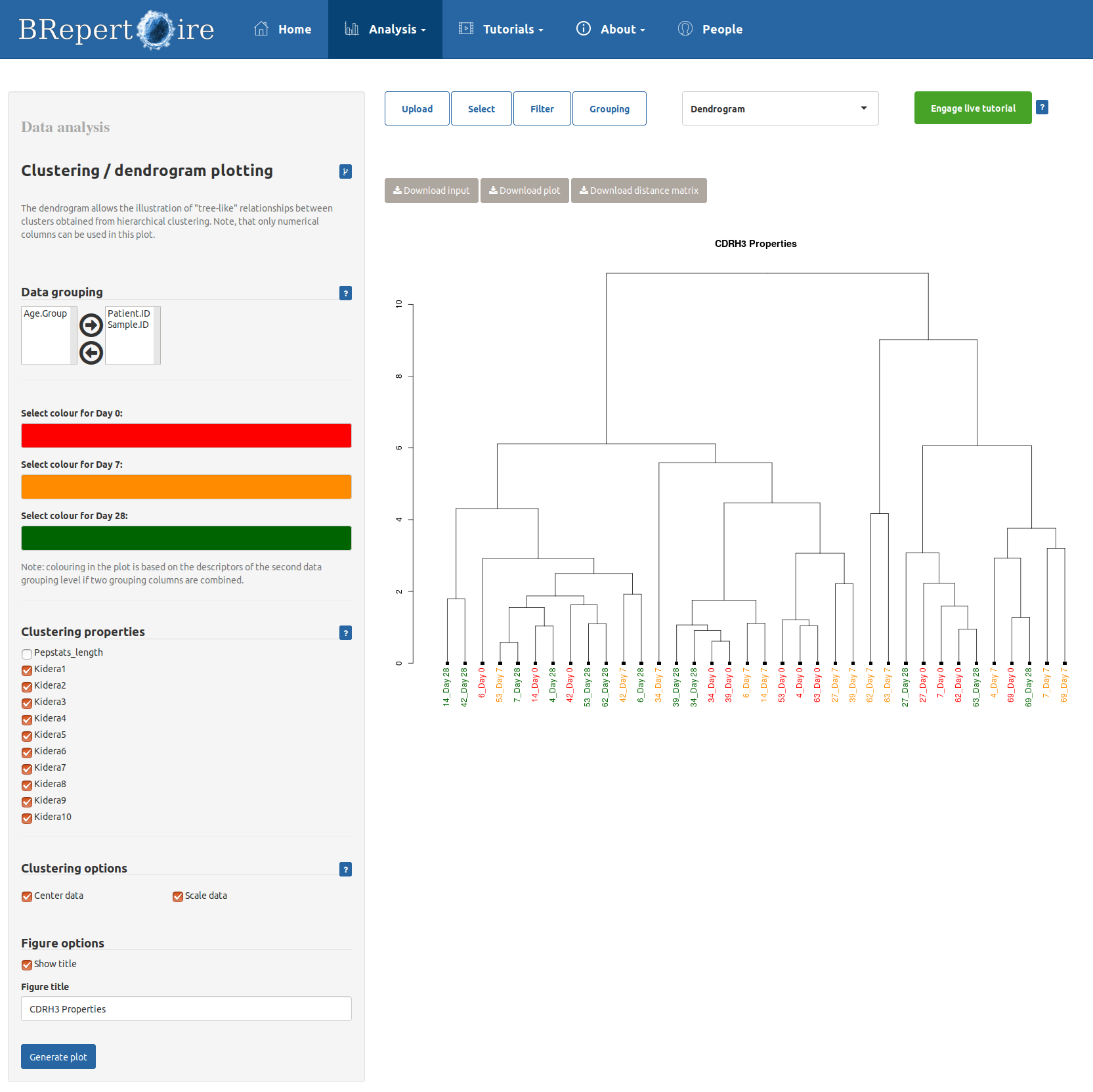 Hierarchical clustering or dendrograms can give useful insights into relationships. As usual, we select the grouping columns we want to use. Note that if two columns are specified the data is divided into all combinations of the levels in the two and the colour is determined by the last column. We will select the columns "Patient.ID" and "Sample.ID". As colours for the levels in "Sample.ID" ("Day 0", "Day 7" and "Day 28") we use red, orange and dark green. For the clustering, we can select all numerical columns in our specified dataset and we will not use the length of the CDR3 of the heavy chain. Note, that the combination of values on different scales is possible, because the data can be normalized prior to the calculations. Centring of the data in order to get rid of the intercept is also possible. By clicking on "Generate Plot", we can calculate the dendrogram. You can download the distance matrix if you wish, to get a quantification of the distances.