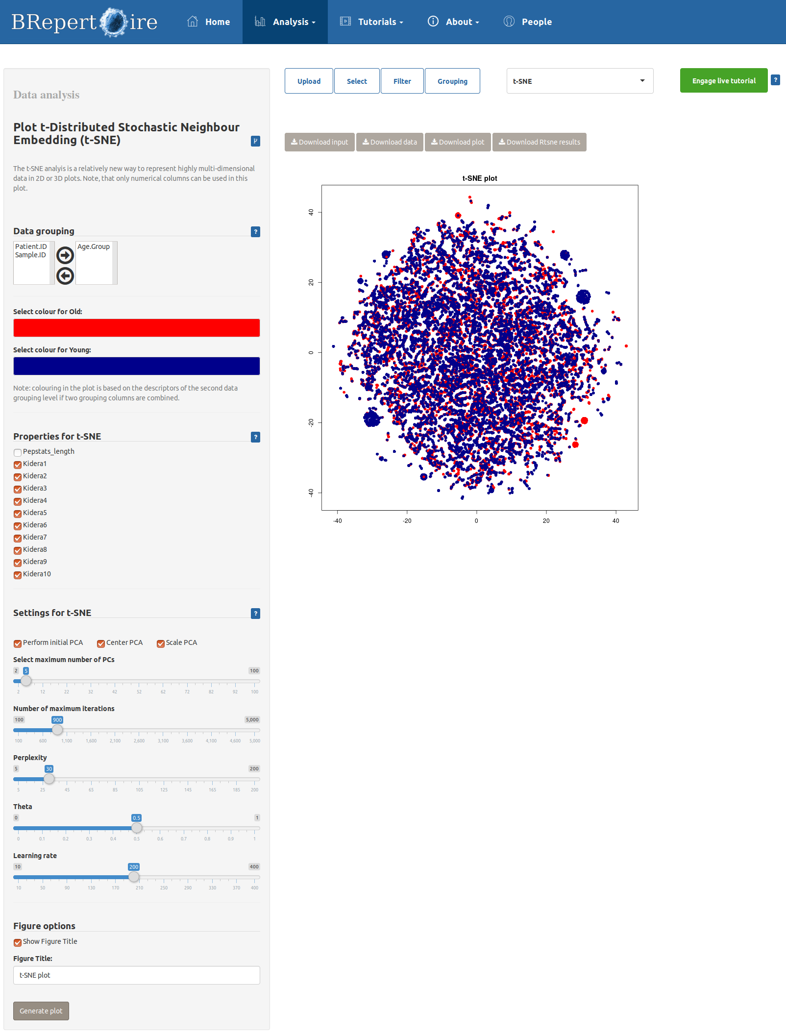 There are other options to visualize high-dimensional data than PCA, among which t-SNE plots are a commonly chosen one. In contrast to PCA, the t-SNE algorithm implements a non-linear dimensionality reduction. This means, that t-SNE plots are inherently more difficult to interpret than PCA plots. The t-SNE algorithm attempts to create a low-dimensional view that contains high mutual information between the distances seen in the low dimensional projection and those existing in the high-dimensional data space. There are multiple hyperparameters one can set which will affect the result significantly. Nevertheless, t-SNE has been successfully applied in many situations and has become an important alternative to standard techniques. In this tutorial, we will split our data only according to the age and set the colours to be red for "Old" and blue for "Young". All numerical columns can be used for the calculation and we will use the ten Kidera factors. You can perform a PCA prior to the t-SNE and select only a subset to form the input for the algorithm. We will select the first 5 principal components to be used. This will hopefully reduce the noise in our data. A critical parameter for a t-SNE calculation is the number of iterations after which the procedure is stopped. This might become time-consuming easily and the computational demand is one of the short-comings of the method. We will set it to 900. The perplexity parameter relates to the standard-deviations of the Gaussians used internally in the procedure and tunes the balance between local and global aspects of your data. In general, the higher this value, the more global the separation. We will use a value of 30 with commonly used values ranging from 5 to 50. The parameter theta tunes the speed / accuracy trade-off and will be kept at 0.5 here. Finally, the epsilon parameter tunes the learning-rate of the algorithm. We will keep it at 200. You might have to play with the parameters in order to get a useful result. We refer to descriptions in the internet for further information and you might also have a look at the underlying "Rtsne" R package's description. Now, click on the button "Generate Plot" to start the time-consuming calculation. This step can take time up to a few hours, depending on the size of the dataset and the parameters. If you do not close the window, however, it should complete properly.