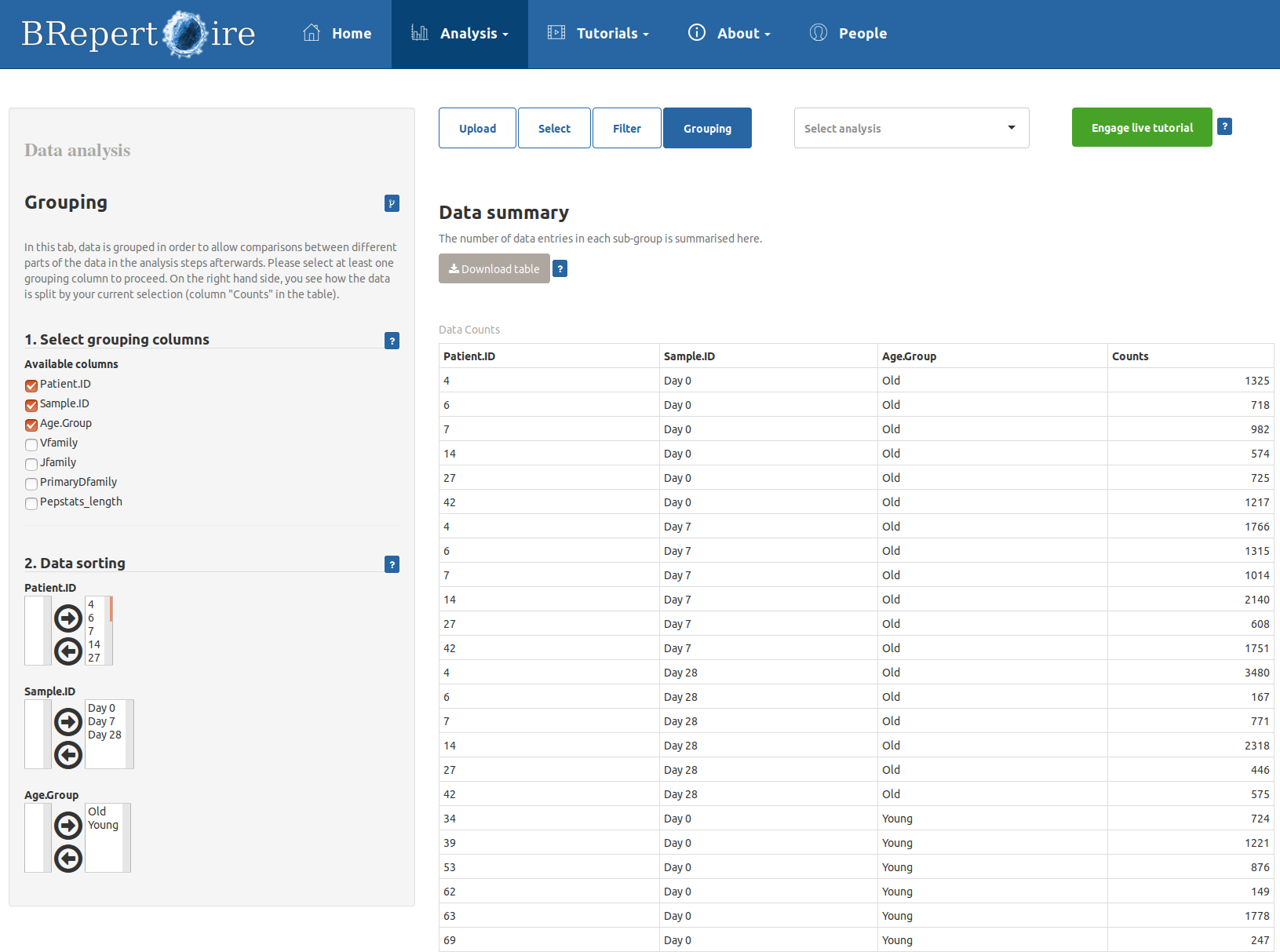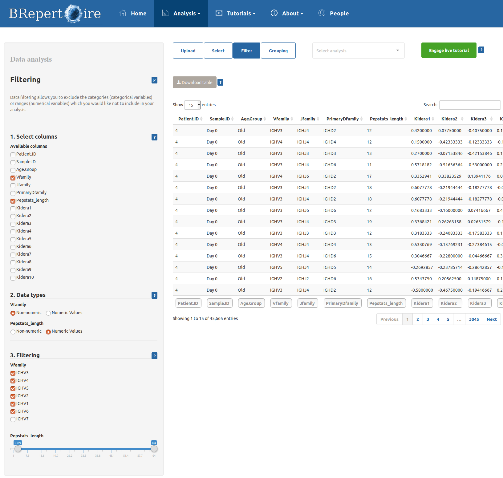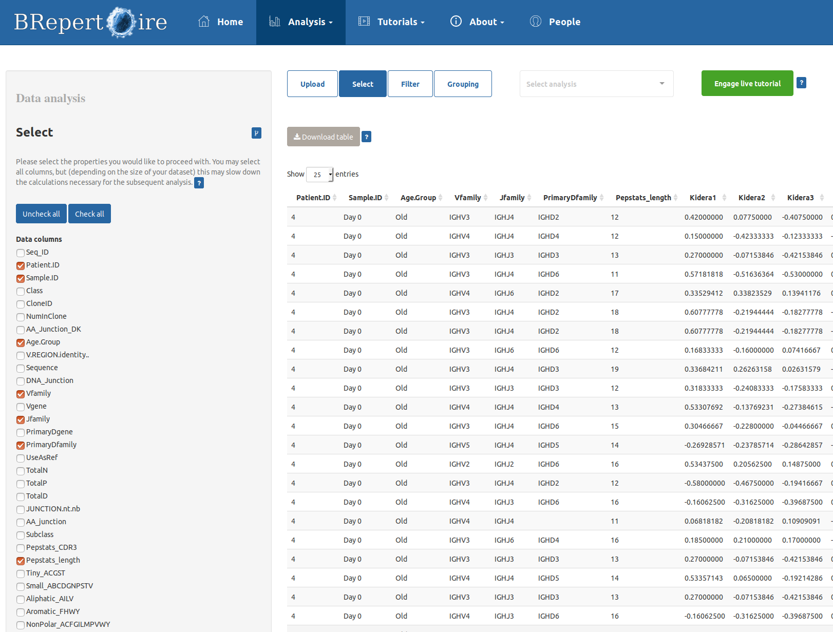 In the first tutorial, you have loaded the repertoire example data - now you need to select the parts of the data that you want to analyse later. It might be that there is much more information available than is currently of interest. For example, the input file we have provided you with has columns for "Sequence ID" and "CloneID" which we will not need in the course of this tutorial. To specify the data necessary to follow this tutorial, you should now select the columns "Patient.ID", "Sample.ID", "Age.Group", Vfamily", "Jfamily", "PrimaryDfamily", "Pepstats_length" and the ten Kidera factors in the left-hand menu. You can see that the table on the right side is dynamically updated when you add or remove columns. If you want to keep all columns or delete your current selection, there are two buttons facilitating that on the top. It also becomes clear that there are different types of values, namely categorical or string columns (for example, "Vfamily") and numerical columns (for example the Kidera factors). Some analysis functions later on may accept either one or both types, depending on their input requirements. The data can be downloaded by clicking on the "Download data" button at the usual location. Note, that if at least one column is selected, the "Filter" and "Grouping" buttons will be enabled. The "Filter" step is optional and allows you to filter out certain values within the columns. For details please see the filter tutorial. In contrast, data grouping is mandatory and is described in a later tutorial.
