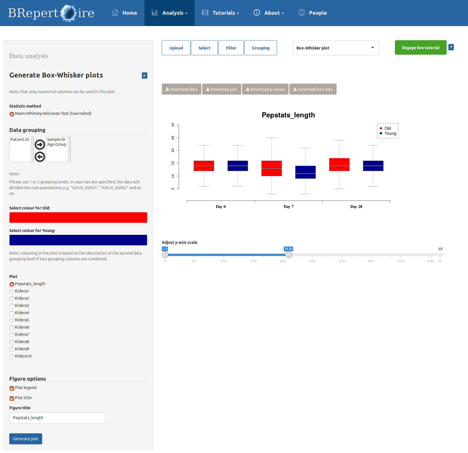 The "Box-Whisker plot" is a fairly common representation of numerical data. To start, please have a close look at the interface on the left. On the top, the available statistical tests are listed. Currently, only the Wilcoxon rank sum test is implemented. For further statistical analyses please have a look at the "Distribution analysis" tab. Below you see the grouping level interface, that allows you to partition the data. You will recognize the three grouping columns we have specified in the grouping step before. Your data will be split according to the values in these columns, for example we have two levels in column "Age.Group" namely "Young" and "Old" and three levels in column "Sample.ID", namely "Day 0", "Day 7" and "Day 28". The data will therefore be split into (2x3=) 6 partitions or boxplot elements in this case. Remember that only the groups in the right-hand box are considered. In our tutorial, we will use these groups in the order "Sample.ID" and "Age.Group". Most functions require at least one and take a maximum of two grouping levels at the same time, which is stated below the respective selectors. In our example, if we had only used "Age.Group" for grouping, we would get a plot where only two boxplot elements are used, one for the "Young" and one for the "Old" group, respectively. The next step is to select the colours for plotting. Note, that the second grouping column in the list is used for colouring if you have specified two, which is "Age.Group" in our case. You can select a colour for every level in the data set and we can change the colour for "Young" to be blue by clicking and selecting from the palette. Below this you have to specify the property that you want to use in your boxplot. Note, that only numerical columns are shown here and grouping columns are excluded. We will select the number of amino acids in the CDR3 of the heavy chain. Below this you have some graphical options, for example whether you want to add a legend or not. By clicking on "Generate Plot" you start the calculation and plot generation, which you can monitor by following the progress bar. As specified, our plot shows the CDR3 length distributions for the "Old" and "Young" groups for the data recorded for "Day 0", "Day 7" and "Day 28", respectively. The first grouping level "Sample.ID" splits the x-axis and the second one is used, as mentioned before, for the colouring. You can see immediately, that the starting distributions for both "Young" and "Old" are very much alike, while the response to vaccination at "Day 7" is definitely different. Three weeks later the values are similar to those at day 0, indicating the normalization of the repertoires. In our example, this might be interpreted as a hint that elder people react differently to this specific vaccination than younger ones in terms of the lengths of the CDR3 of the heavy chains. For all analysis tasks, the appropriate download buttons will be displayed on top of the right-hand tabs when ready, in this case including p-values. Note, that some plots might look a bit different when downloaded because a different engine is used to generate them. Alternatively, you can download the plot you see by a right-click or by taking a screenshot. The next tutorial will deal with the "Bar plot" function.