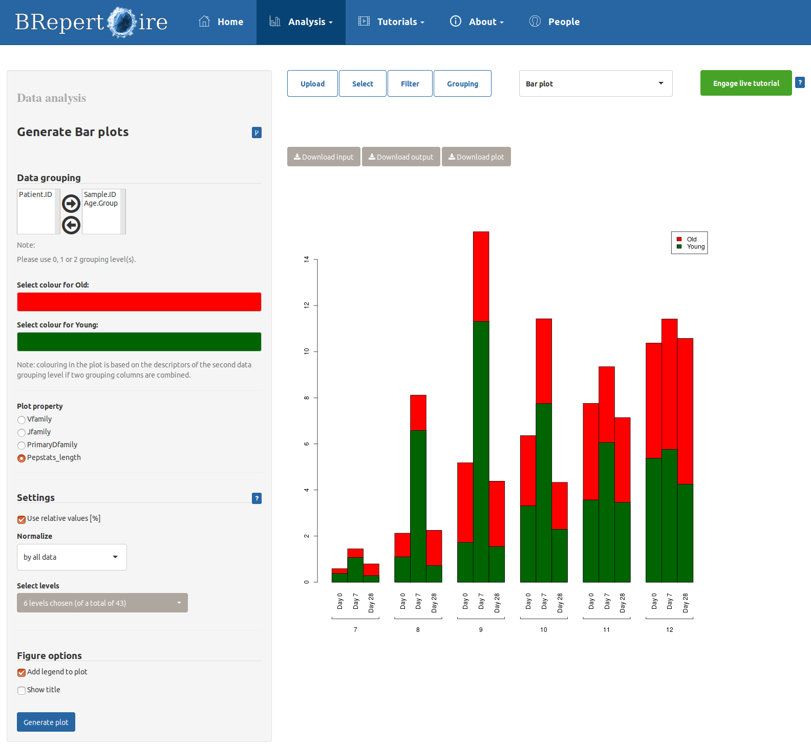 In the previous tutorial, we have examined the differences in old and young people in terms of the response to a vaccine. To this end, we have used the length of the CDR3 part of the heavy chain in amino acids. This can also be illustrated using the "Bar plot" function. On the left, we have the grouping level interface and we will set it to use "Sample.ID" and "Age.Group" as before. Remember that you can change the order of grouping levels in the grouping tab as described above, and that only the groups in the right-hand box are applied. In contrast to other functions, you do not have to use a grouping for the bar plot in which case you would plot the entire dataset. However, in our example the first grouping column will again lead to a data split along the x-axis and the second one will be used for colouring - the very same way as in the previous tutorial for the boxplot. Now, we have set the colours to red and dark green for the "Old" and "Young" groups, respectively. Now, for the selection of the plot property, note that both numerical and non-numerical data can be used. For non-numerical data such as the "Vfamily" BRepertoire internally counts the occurrences of the levels in the data partitions and uses this count for plotting. This can be useful, if you want to compare immunoglobulin classes for example. However, in this tutorial we will again use "Pepstats_length" to proceed with our analysis. Below this checkbox input you can set further options. Firstly, you need to decide whether you want relative or absolute values. While the latter are useful to look at absolute differences, relative values will be probably preferred in cases where the number of observations in the different groups varies. Although we have a comparable number of observations for both the "Young" and "Old" groups, we will opt for that here. We also need to select the property values we want to plot. The number of amino acids in our data set ranges from 3 to 64, remember that we filtered CDR3s with less than 3 amino acids in the filtering step. The most interesting region in this case is the range between seven and twelve amino acids. Since we are now using only a fraction of the data for plotting, we might also use the "In respect to all data" option. This will result in the relative value calculation being performed on all the data, while the plot will only show the selected levels. You can try this out on your own to see the difference later. Moreover, the default setting "by group" normalizes the data per group on the x-axis. Finally, we set the available plotting parameters such as the title of the figure and click on "Generate Plot". You can immediately see the most pronounced difference in the groups, which is a massive expansion of the fractions of lengths eight, nine and ten in the "Young" group. This is likely to be caused by the vaccine, because this happens only in the samples taken one week after the vaccination. You can also see that this pattern is not visible in the "Old" group, probably indicating that the response was less intense. Since these data are relative in respect to the first grouping column, the "Sample.ID", and we selected a calculation of the values considering all data, the visible bars for "Day 0", "Day 7" and "Day 28" do not sum up to 100 percent. The next analysis will be the "Distribution analysis".