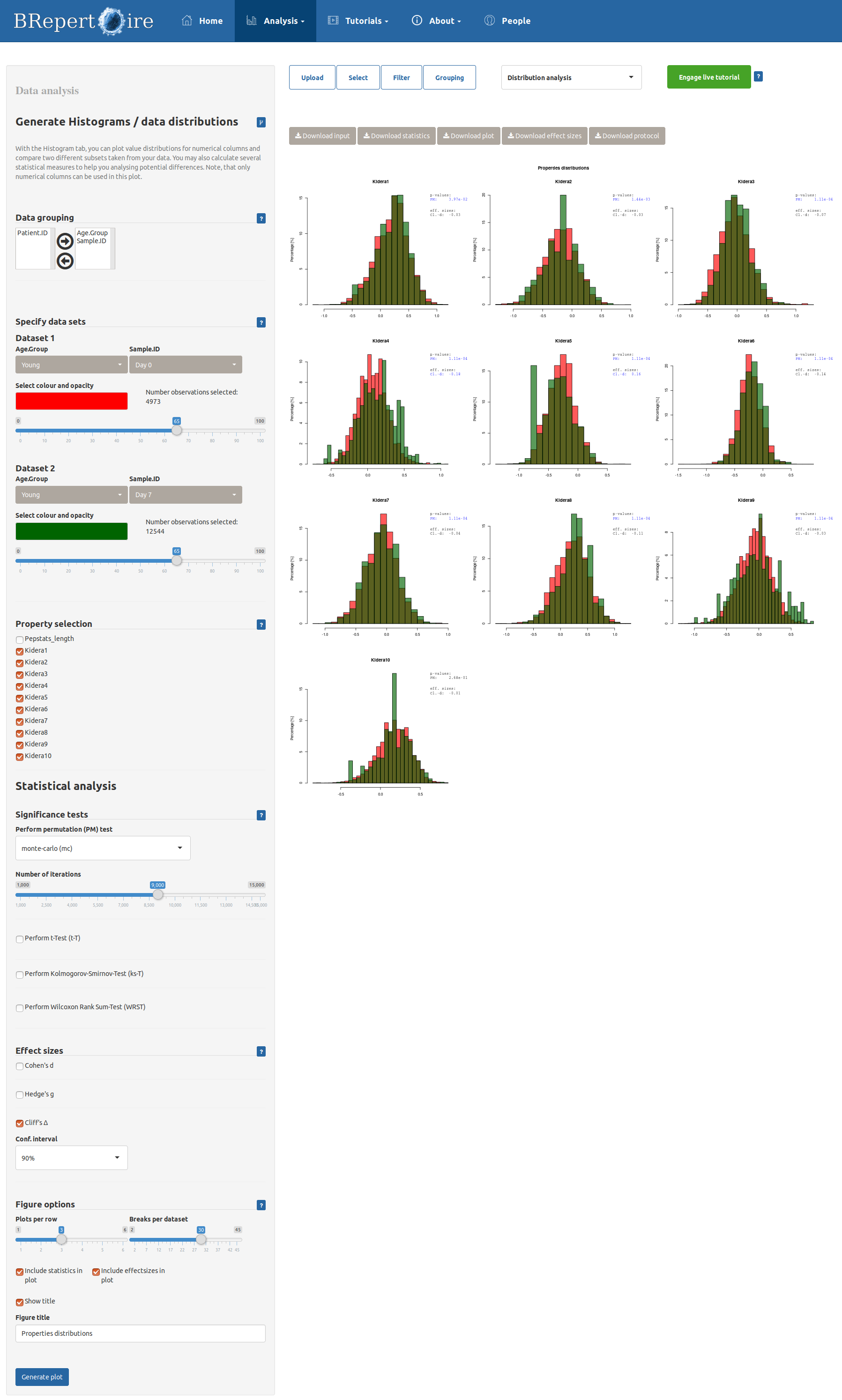 If data has been clustered using multi-dimensional data, it might be tedious to search for individual differences in numerical properties. To support the user with this task, we provide the "Distribution tab" which allows fast comparisons of value distributions and the calculation of various statistics. In our example, we will probe whether there are any differences between CDR3 characteristics of the Young group at "Day 0" and "Day 7", respectively. To that end, we first select the appropriate grouping columns, "Age.Group" and "Sample.ID". Note, that the dataset selectors are updated and allow us to specify the two data subsets we want to compare very easily. We will set dataset one to hold all entries which are "Young" and taken on "Day 0" and dataset to hold those which are "Young" and taken one week later. Note that the number of observations in the datasets is automatically shown, excluding NA containing ones. Finally, we set the colour of the second dataset to be green and the opacity for the histogram plots to be 65% to improve the readability of the plot. This function can process multiple properties simultaneously, so we will select the ten Kidera factors. We can set multiple different statistical properties to be calculated, which make different assumptions on our data and have different strengths and weaknesses. For example, the widely used t-test assumes that the data is normally distributed and the observations are independent from one another. If this is not the case, the calculated p-value might not be very reliable. The same holds for the effect size measures that are supported. To use a stable, non-parametric approach, we will use a permutation test with 9000 iterations and calculate Cliff's delta. You might also want to set some plotting parameters. At this stage, we are ready to start the calculations. Just be aware, that the permutation test will take quite a while, which is the major drawback of this method. In the generated plot, you can see the histograms where every pair of red and green bars uses the same spread to make it comparable. The number of bars differs as it is optimized by the underlying R function "hist". The calculated statistical measures are plotted in the respective data partitions. Note, that blue text means "significance", which is a value below 0.05 for the p-values and according to the respective effect size tables for the effect sizes. By using this functionality, a lot of potential major differences between parts of your data can be screened quickly and efficiently. As a final remark, we would like to add that if you are unsure which statistical test to use, you might want to perform a Kolmogorov-Smirnov or ks test, either in the standard R implementation or the weighted version we provide for tailed data which has been implemented by Rand Wilcox.