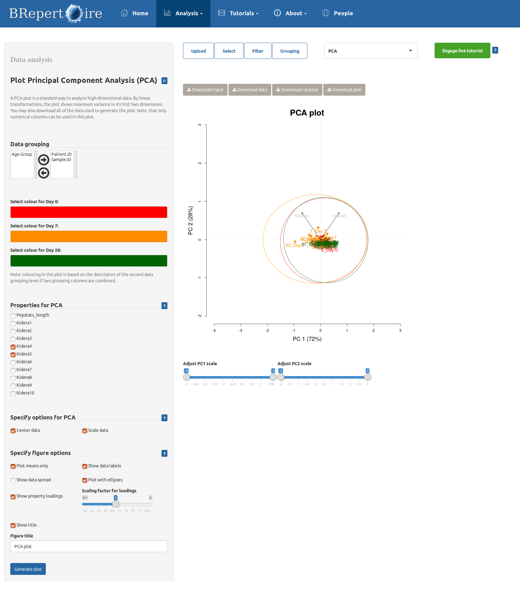 A standard way to reduce a multi-dimensional space to a 2D or 3D representation is the principle component analysis or PCA. It is a linear transformation of the covariance matrix of the data, representing the data along orthogonal eigen-vectors, ordered such that the first eigenvector shows the largest variance in the data. For example, the first eigen-vector or principle component will always contain more variance than the second one and so on. In our example, we might ask ourselves whether data obtained on "Day 7" differs from the other time points, since that has been implicated by the distribution analysis described in the previous tutorial. Firstly, we select the grouping columns, namely "Patient.ID" and "Sample.ID". In this example, just using the "Sample.ID" would also be possible, but in order to plot multiple mean values, we will use a second grouping column. We can select different colours for the second grouping column. As the distribution analysis earlier suggested, there might be a difference in Kidera factors 4 and 5 so we will only use these two, to mimimise any noise. However, in principle one could use many more dimensions. We will plot the means which are calculated after the projection and label them and we will set the data ranges or ellipses and property loadings to be enabled as well. We have chosen to disable the spread annotation in this case. When we click on "Generate Plot" the calculation starts. Note, that BRepertoire notifies you when certain adaptations to the data are made for example if NA value-containing rows are removed prior to the call of the "prcomp" function. As you can see from the plot, "Day 7" has indeed a different spread whereas "Day 0" and "Day 28" are similar to each other.