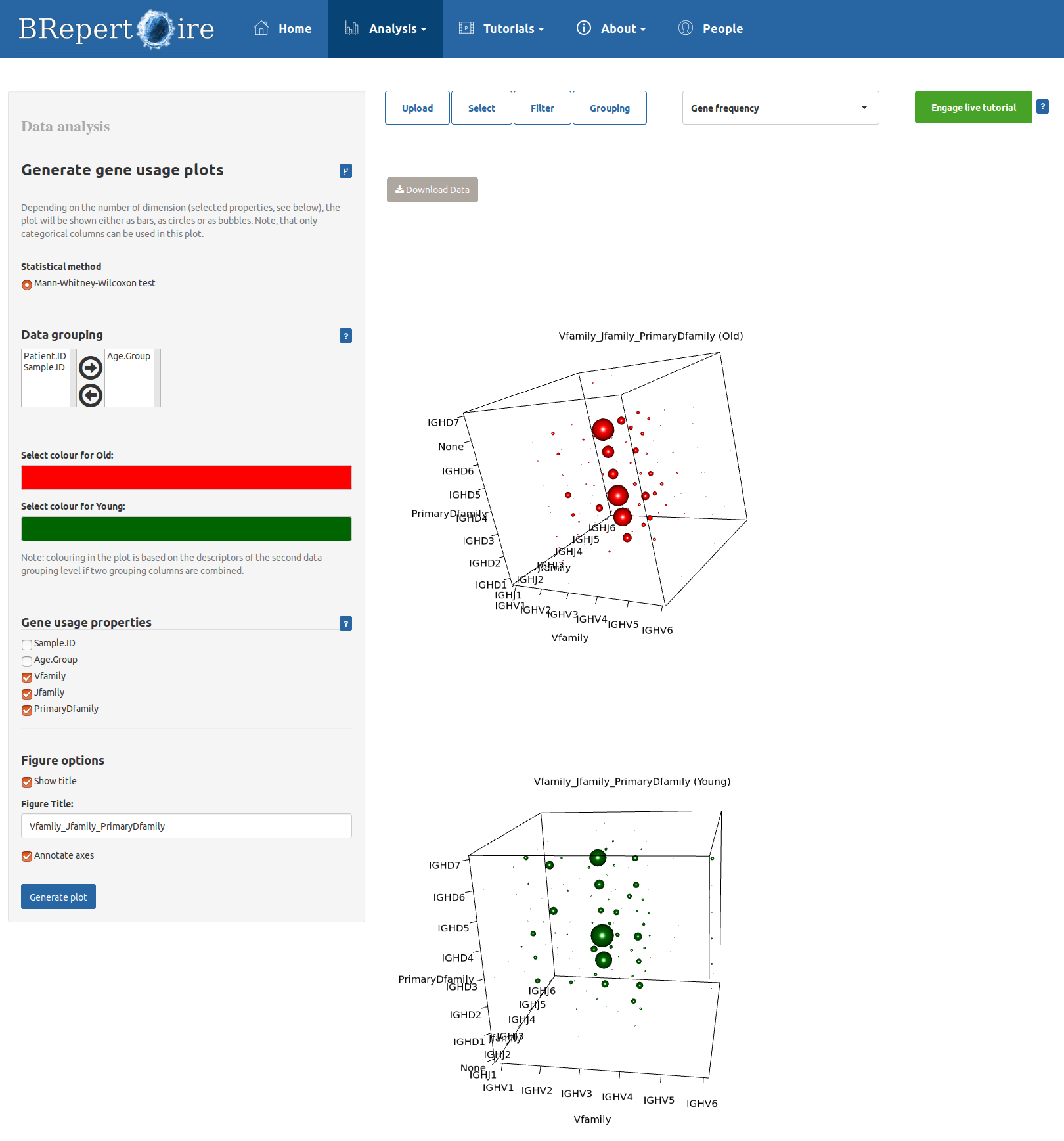 When it comes to antibody repertoire data, another very common analysis is the monitoring of the V(D)J gene usage for different subsets of the data. The server supports 1D, 2D and 3D plots to show the fractions, but in our tutorial we will generate 3D bubble plots. First, set the grouping columns to be "Age.Group", which will split the data into "Young" and "Old", respectively and hence result in two plots. We can set the colours as usual and will set the "Young" group to be represented in dark green. Next, we select up to three dimensions for the plot. Note, that only non-numeric columns are available here. The number of properties you select will determine the dimensionality of the plot. We will select "Vfamily", "Jfamily" and "PrimaryDfamily" for which we are going to generate bubble plots. After clicking on "Generate Plot", the bubble plots are shown on the right-hand side. Note, that you might have to move up and down to update the rendering. You can rotate the plots by clicking into the plotting area and holding down your mouse button. However, in contrast to 1D or 2D plots you cannot download the plots directly. After orienting the boxes appropriately, we suggest you make a screenshot and cut the plot afterwards. You may also try to do the 1D and 2D plots by de-selecting one or two dimensions on the left on your own.
